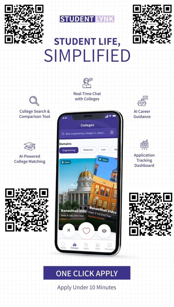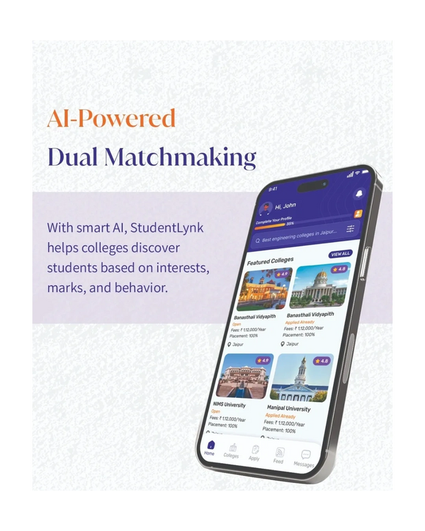 StudentLynk helps students take control of their college admissions journey with simplicity, speed, and support. From creating one profile to getting AI-matched with top colleges, applying takes just one click. With real-time chat and personalized career guidance, students get the clarity and confidence they need — faster and smarter than ever before.